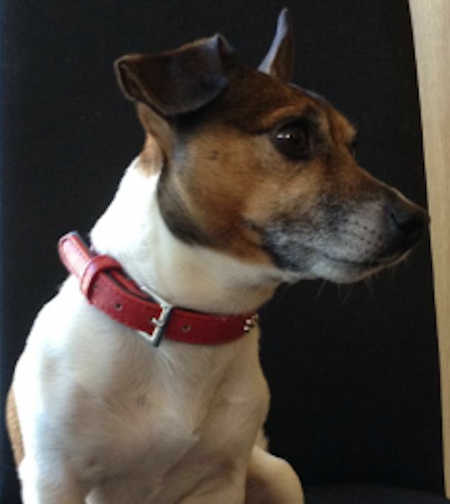 Brown and white small Jack Russell black muzzle which is now very grey, usually has her left ear up and her right ear down but that's not always the case, Lottie has a long tail