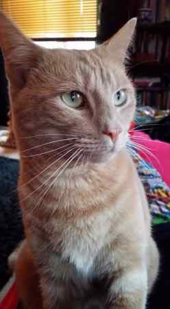 He is a sandy ginger colour with faint tiger stripes and green eyes.