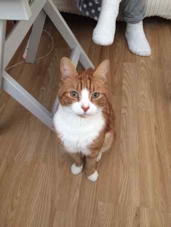 Been missing for a month. Very vocal male, neutered and chipped ginger and white cat.