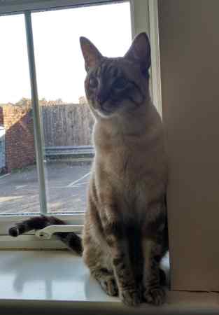 Hello, we are Fatima and Alfonso. We are looking for cat of race similar to the Siamese. It is a female. She is 1 year and 6 months old and weighs about 5 kg. She is tabby with brown stripes, blue eyes, and on the side she has a kind of brown round spot. It's called Chancla. It happened on January 13, 2017 around 3:00 pm in the area of Northcote Road and its surroundings, in Bournemouth.