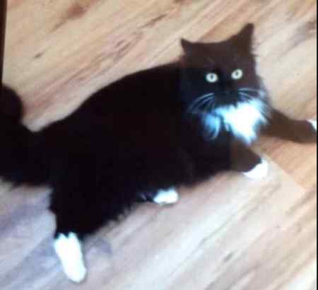 All black was fluffy with white chest and 4 white paws one of her back legs knee length , tiny tip missing from one of her ears