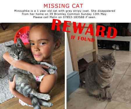 Grey stripy young female cat went missing from Bromley (south London/ Kent) on the 13th of May. She is chipped and neutered. She is petit and quite skinny. She has very define dark grey marks over her eyes almost making her look "clown" like.