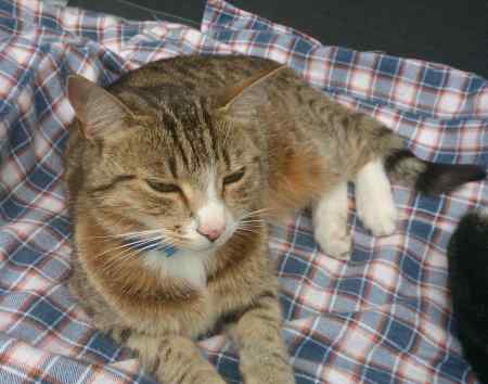 Tabby, grey/brown with black tabby stripes and ginger patches. Black tipped tail. Four white paws, White chin and nose. Very timid, easily frightened, unlikely to let anyone pick her up.