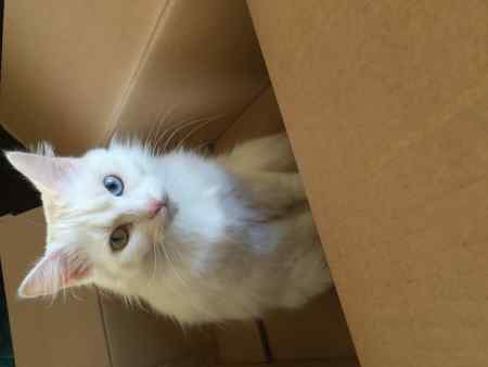 White fluffy cat one blue and one green eye. Lost from Elmwood Drive in the morning 20th July 2018