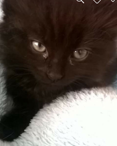 She is all black and fluffy with a black fluffy tail her fur can look a bit reddish when the suns on it ,she has a few white hairs on her neck ,she also has a loud meow