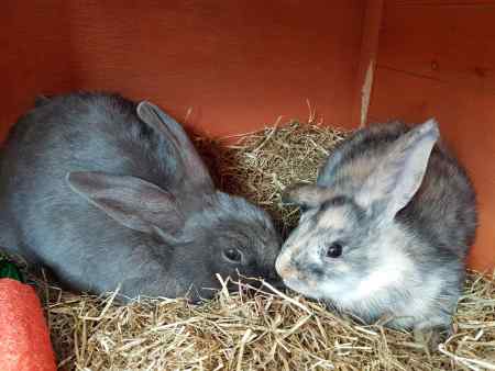 Has a white smudge on his nose. He is a blue grey colour with odd patches of brown. Also a female multicoloured female rabbit.