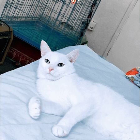 Pure white, neutered, deaf and has a bit of fur missing on his tail.