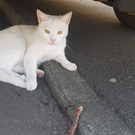 He is about 3 years old, completely white,medium size, has a gentle meow,lots of tiny scratches on his body because he usually gets into fights with other cats.
