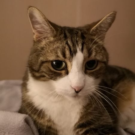 Tabby and white, chubby, very friendly but probably nervous of strangers. Short fat tail with a kink