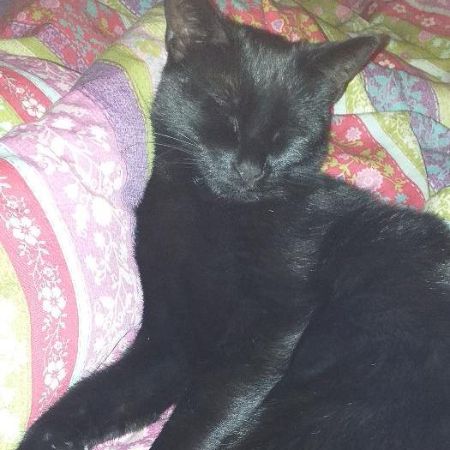 a few white hairs on front of neck and back paw. Yellow eyes. Very shiny black coat. He gives himself many tongue baths a day. He is very shy and nervous around strangers. He is medium sized and lean.