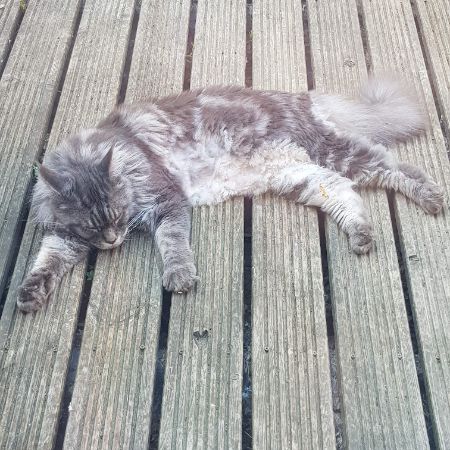 Neutered Male, approx 9 years old. Silver/grey tabby pattern. Weight ~9kg, broad look. Distinctive kink in tail due to bone defect, around 2/3rds from base. Gentle nature, can be quite vocal.