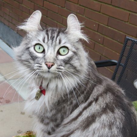 Silver and black spotted American Curl, curved ears, red collar, gold tag.