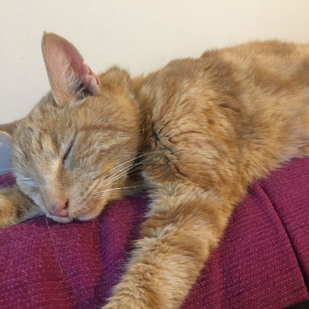 Friendly, slim, all ginger barred tabby with circular markings on his side. He has a chipped canine tooth and a hip that sticks out slightly when he is sat up.