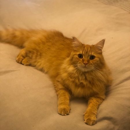 Gerry is ginger, with a white chin. He has super fluffy ears and feet. He has little black markings on his lower gums. He’s very vocal.