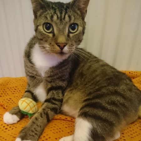 Tabby with spots and stripes on the back with some white on his chest and legs