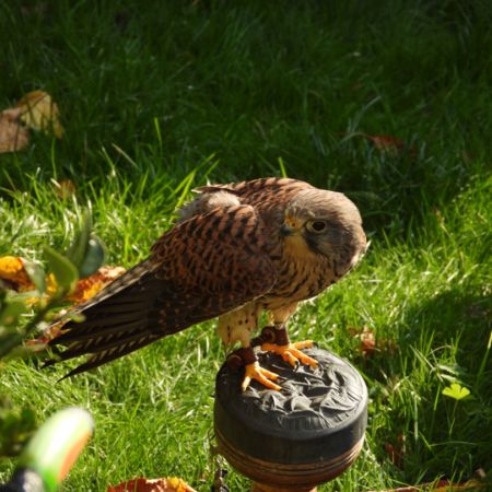 Young male kestrel brown , with grey head . Wearing leather anklets and Jessie’s.