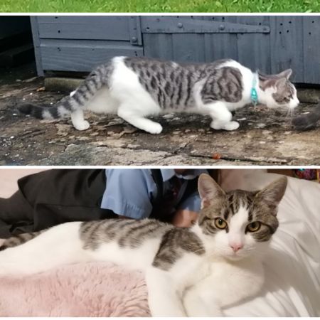 Grey tabby with full white legs, neck, tummy, white cross on back of neck and white separating tabby back from stripey tail.