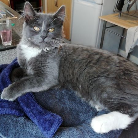 GRACIE is dark grey and has white fur on chest and paws. She has a bushy tail.