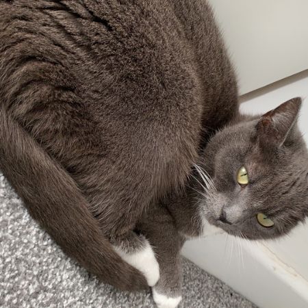 Grey is her name and she is grey with a white chest, green eyes, her paws are white and her back paws are more white than her front. She also has a tiny few white hairs inbetween her eyes almost like a little patch of white. She is very vocal especially if spoken too.