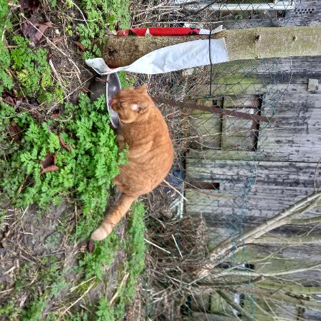 Have seen this cat on & off since last year, but now appears every day & is living in a neighbour's outbuilding. I am feeding it once a day. It is becoming very friendly after a wary start, so has obviously had contact with humans in the past.