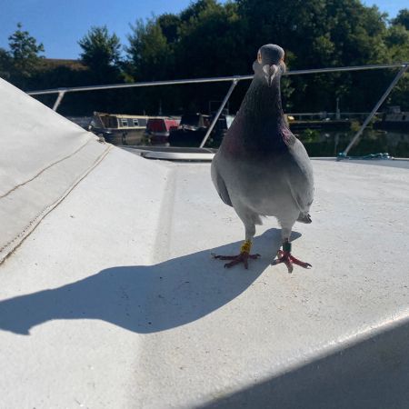 grey pigeon found in my boat been there two nights thankfully water was in sink so had a drink. Let out have more water and some food. Assume he will fly home soon. Lovely bird.