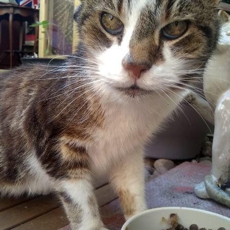 Found in my garden looks old white and tabby skinny sunken eyes