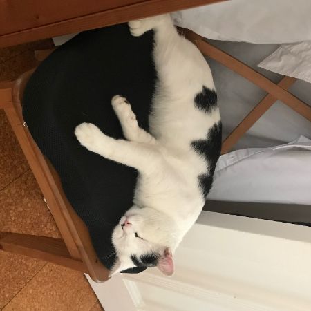 A mostly white cat with a few black patches on his back and a black tail. His face is mostly white with a black patch between his ears and a very small black mark in the corner of his right eye and one around his left nostril. He has light greenish, yellow eyes.
