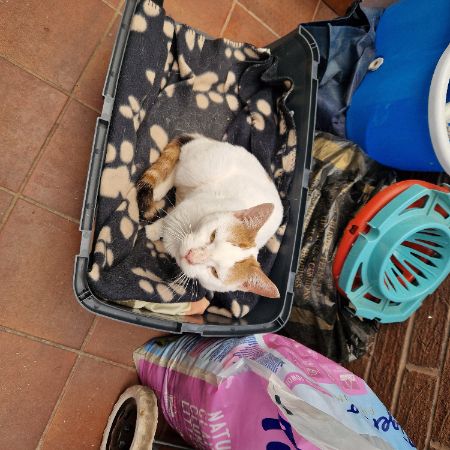 This female cat has been around our bungalow for past 5 days. She was skin & bone so on Fri eve, we couldn't leave her out in the freezing cold so took her in, fed & watered her and she's now currently in our conservatory