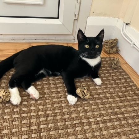 Small male short haired domestic black and white cat. Very friendly and sweet. White under chin and chest. White paws.