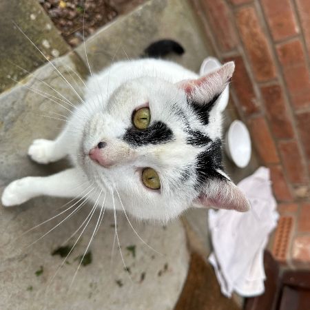 Cat is mainly white with a black tail, and a few black splotches on face. I saw this cat two years ago, since then the cat has sometimes appeared for food