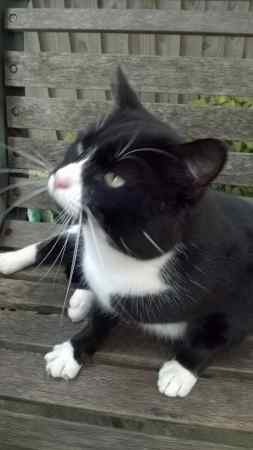 Black with white socks and bib, quite big, always hungry, loud miaow. Affectionate and enjoys being stroked