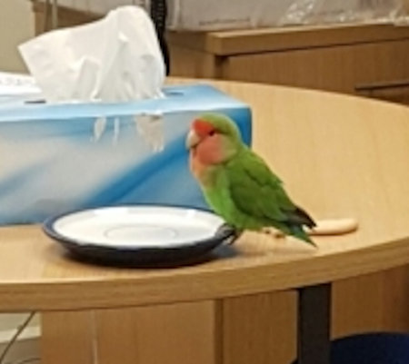 Other Information: Peach faced lovebird flew into our office, friendly bird, good condition. Have contacted the RSPCA who will take it to the local centre by the end of the day (Monday 13th March 2017)