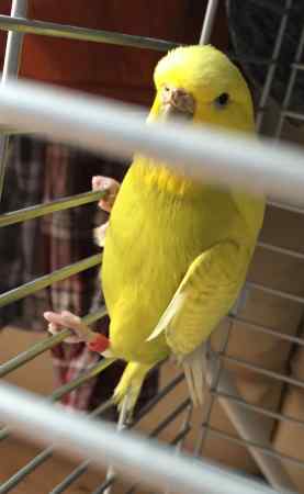 Very bright yellow budgie found in our backyard. Seems uninjured and in good condition. Semi friendly, allowed herself to be scooped into a carrier but not fussed about being approached.