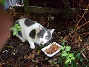 The Cat is living in my front garden. I cannot bring it into the house as I have 3 cat-hating Terriers. Seems friendly but timid.