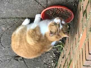 He seems to be starving hungry and eating 3-4 pouches at a time with biscuits. He is now sleeping in a box in my garden and is living there. He has chip but can’t locate owners.