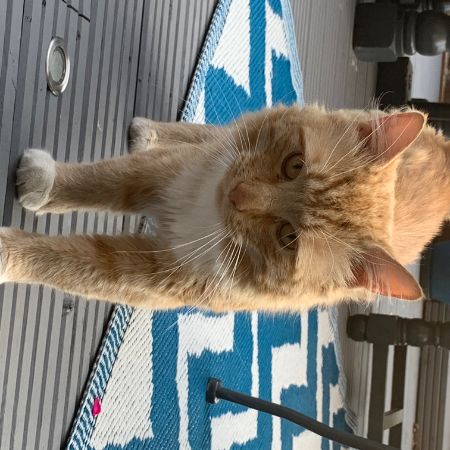 Amber/ginger body, white bib and paws, very vocal, big paws