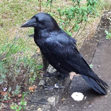 CAMP RAVEN RING Corvid/Crow/Raven. There is a large crow in my garden. Quite bold with me, and doesn't look injured but cannot fly (perhaps wings clipped?). It has a metal ring around its leg which says CAMP RAVEN. Has been fed fruit and nuts.