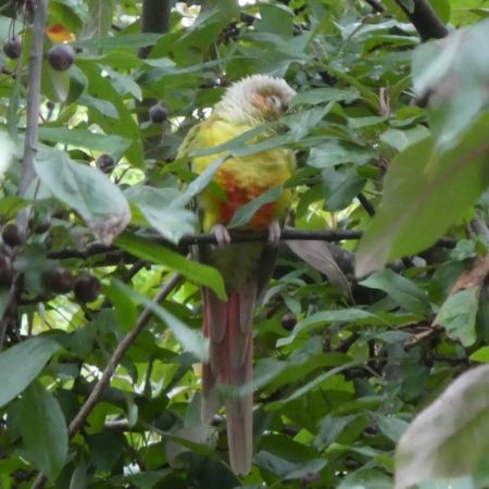 Greyish cap, paler white-ish eyering, yellowish chest, red patch on belly, green vent, reddish undertail (only seen from below). I'm a bit rusty on my parrot ID, but it looks a bit like a /Pyrrhura/ sp. parakeet to me.
