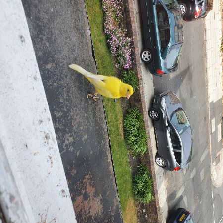 A yellow bird with a ring around its leg had landed on my window sill this morning and stayed there for around 20 minutes. It looked very friendly and lost.