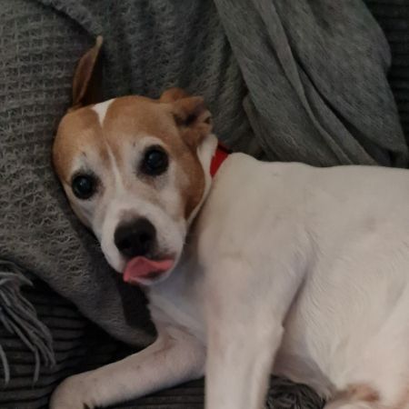 Stanley is a white with brown patches around his eyes. He is a jack russell, staffie cross He has a brown collar on .He was lost on 13/11/21 from Gladstone park NW2