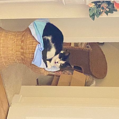 Milo is black and white male cat. He has a black chin. He is usually very friendly and he is a large boy.