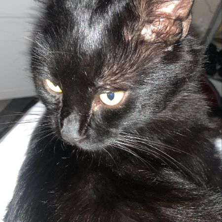 He is 2 years old, completely black, semi long haired cat. He has a few scratches on his head and a little white fleks of fur.