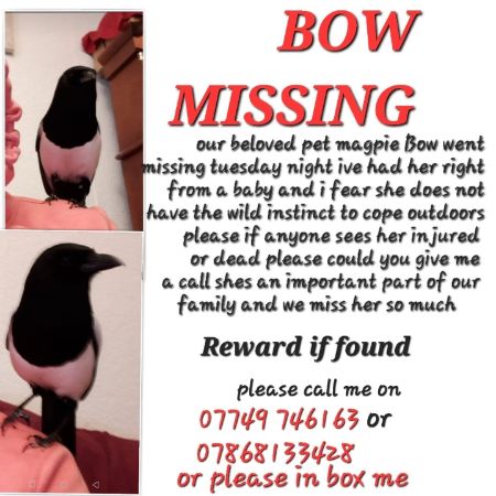 Report your missing bird on our Bird Registers for free and we will do a pet match to display any birds which match in the area. You can also create and print your lost bird poster. Report a missing bird here