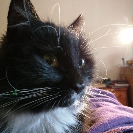 Fluffy black & white cat. Black robe with white patches on paws, nose, front neck and belly.