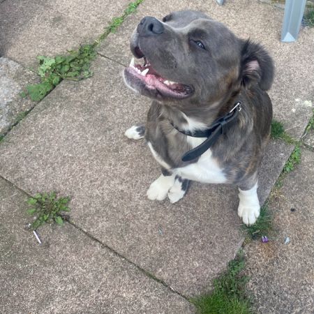 Blue has a blue face and brindle body, with white paws, he has a scar on his right back leg after having surgery.