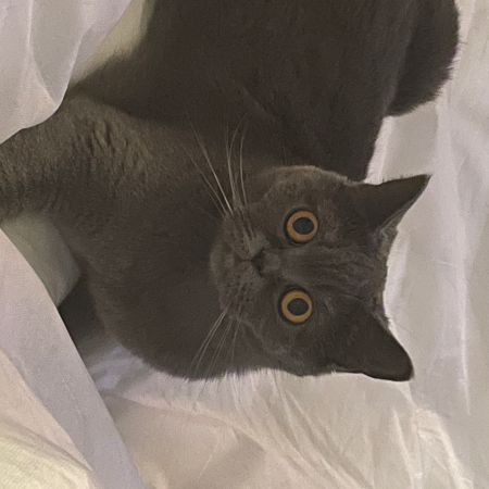 She is a small grey British shorthair cat. Very nervous. Yellow eyes.