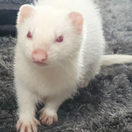 Albino ferret (white with pink eyes), long tail with a slight kink. Knows her name is Daisy but also answers to "boobaloo". Normally a bit timid but might bite if she feels threatened.