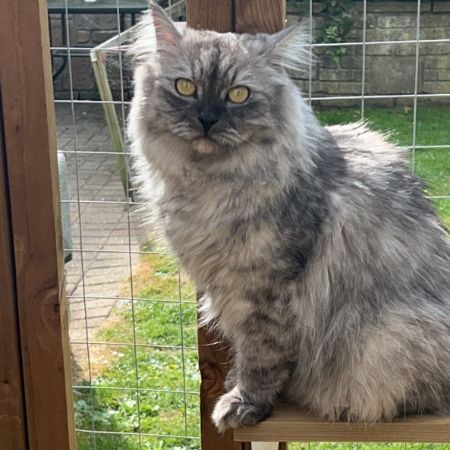 Grey fluffy tabby. Bright yellow eyes. Recently transported from Czech Republic. Escaped out of back garden into neighbouring garden and not seen since