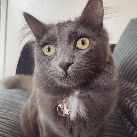 Sylvia is grey all over with a small patch of white on her front and on her belly. She was wearing a pink collar with a strawberry pattern on and a bell. She is very vocal and will meow in response when spoken to. She has a very calm temperament and will approach when called