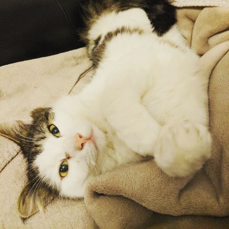 Quite long hair for a tabby, white with brown patterns throughout fur. Very fluffy tail. Quite timid.